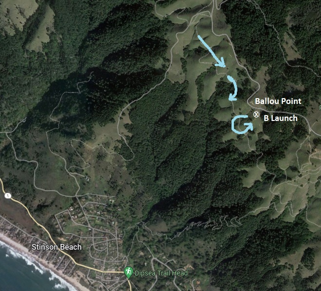 When we have NW winds (pictured by the blue arrows) flowing along Bolinas Ridge, the wind gets forced out and around (as well as up and over) Ballou Point. At B Launch, this creates a rotor that can sometimes result in a West wind at launch. This apparent west wind has fooled many pilots into launching into the rotor.