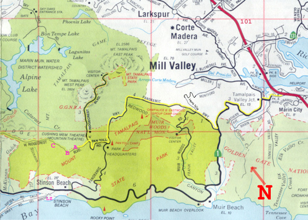 From Hwy 101 in Mill Valley, take the "Stinson Beach / Hwy 1" exit. Follow Shoreline Hwy and Hwy 1 about 1/2 mile to Tam Junction, where they will turn left at the traffic signal. Continue west on Hwy 1 for 2.7 miles. Then, look for the sign which directs you to turn right onto Panoramic Hwy for Mt Tam and Muir Woods. About 0.8 miles up Panoramic, you will come to a wide intersection shaped like a crooked pitchfork. Select the middle fork to continue across on Panoramic. Follow Panoramic for another 4.4 miles to its highest point. On your left, you will see the Pantoll Ranger Station, and on the right will be Pantoll Rd. Ahead of you, the highway will begin dropping down to Stinson Beach and the LZ. Pilots must sign in at the ranger station before flying.